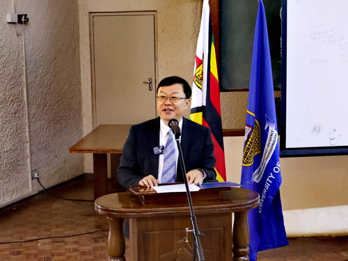 2026年3月27日,驻津巴布韦大使周鼎出席2026年津巴布韦大学孔子学院“国际中文日·汉字英雄大赛”并致辞。津大人文学院院长曼格纳、孔院师生等近300人参加。